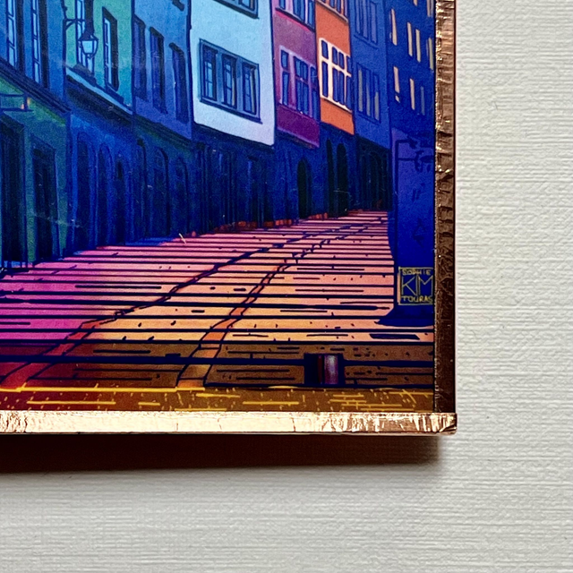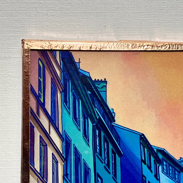 L’œuvre est encadrée à la main par l’artiste, sous verre et prête à être accrochée. Son cadre cuivré intense met en valeur chaque détail et apporte une finition soignée. Parfait pour les amateurs de dessin urbain et de décoration originale.